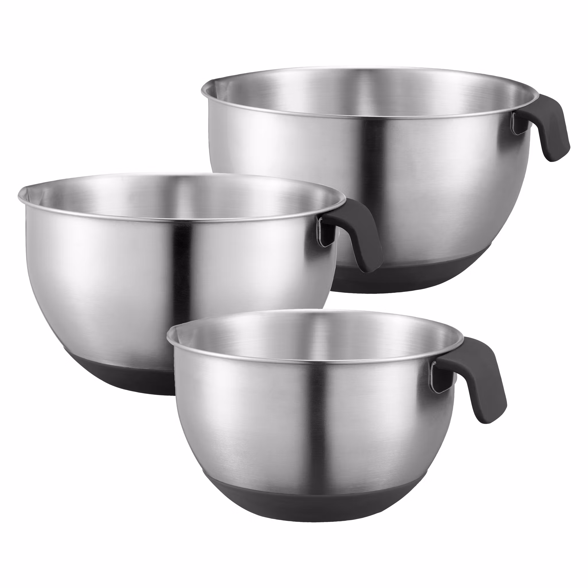 Rejäla bunkar i rostfritt stål för kökets all matlagning och bakning.