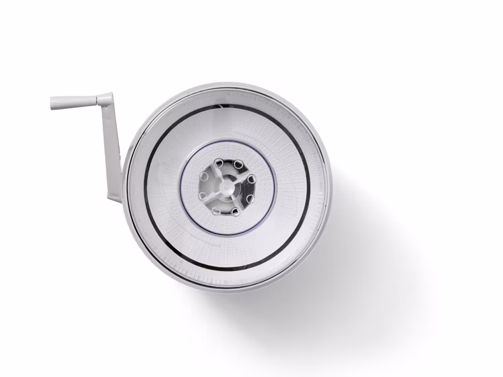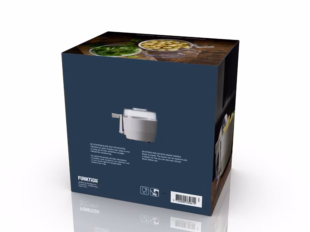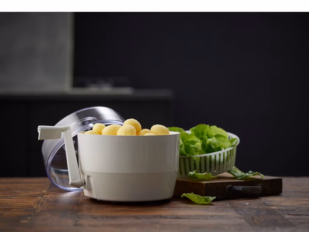 Salladsslunga Potatisskalare med vevhandtag. Tillverkad av plast. Skalaren kan ersättas med en korg så att du även kan slunga sallad. Tvätta före användning.